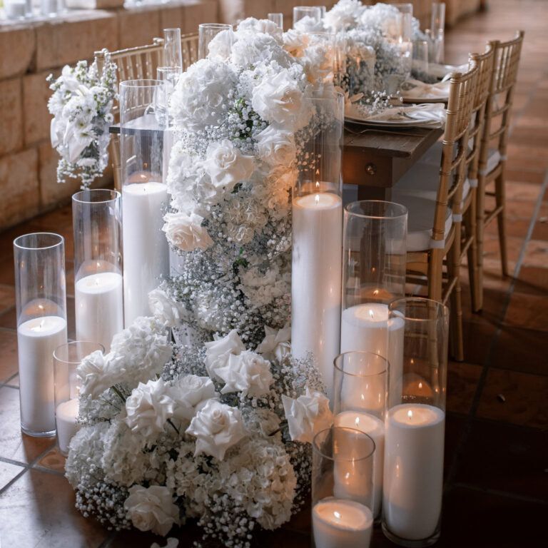 Create a breathtaking glow with our premium glass cylinder vases and real-flame candles. Perfect for aisles, staircases, stages, entryways, and tabletops.